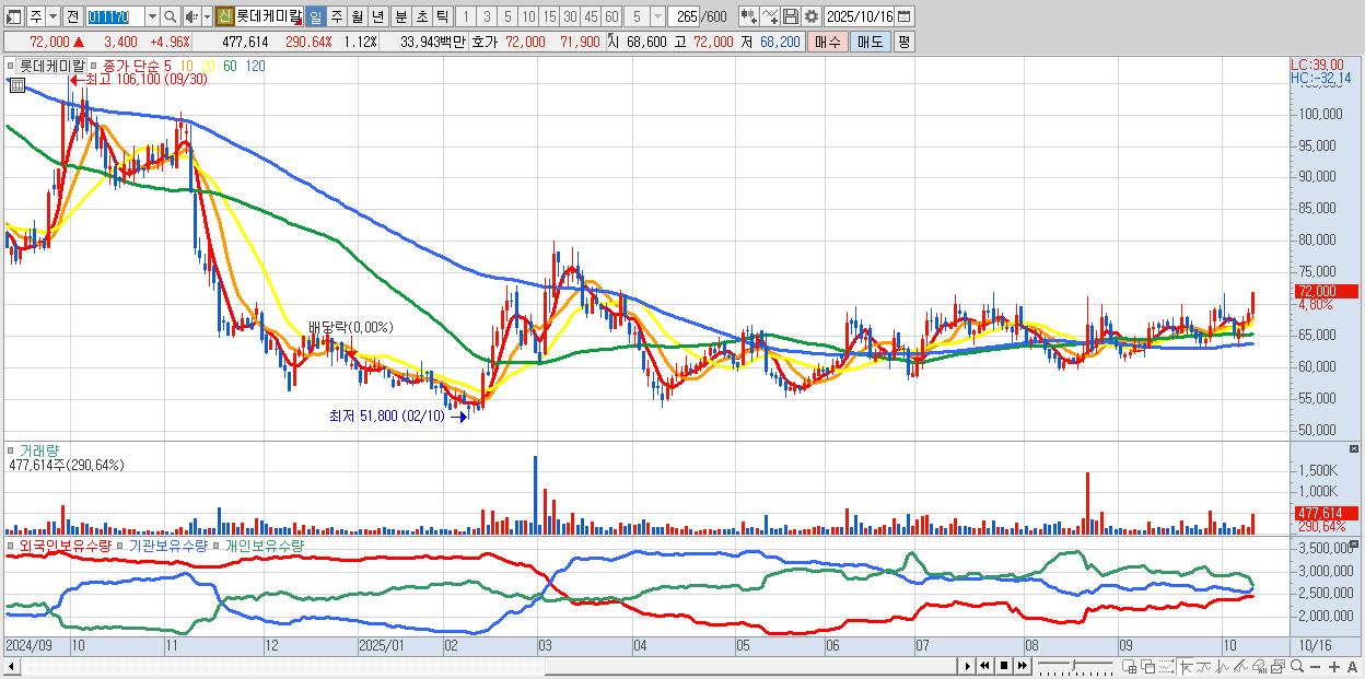 - 롯데케미칼 (72,000원 ▲ 4.96% , 시총: 30,798억, 외국인 순매수 거래금:101억)