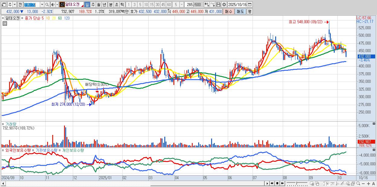 - 알테오젠 (432,000원 ▼ -2.92% , 시총: 231,145억, 외국인 순매수 거래금:108억)