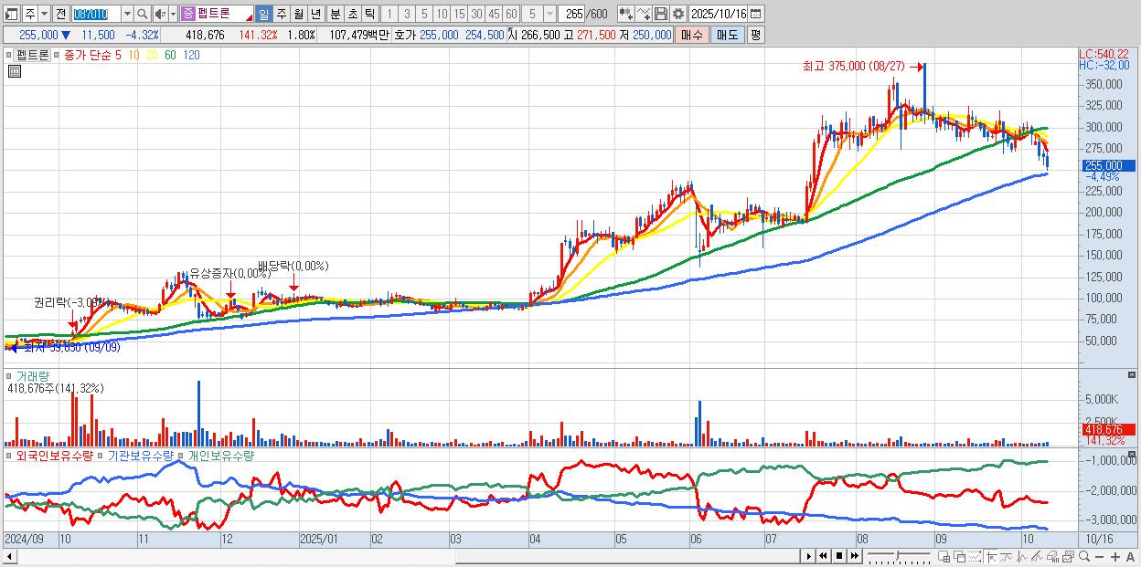 - 펩트론 (256,500원 ▼ -3.75% , 시총: 59,809억, 외국인 순매수 거래금:138억)
