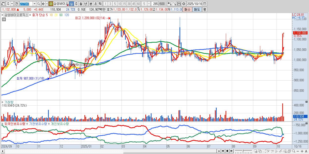 - 삼성바이오로직스 (1,133,000원 ▲ 0.53% , 시총: 806,401억, 외국인 순매수 거래금:162억)