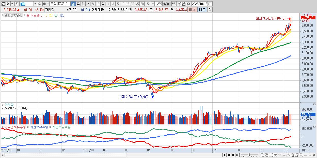 | 10/16 | 3,748.37 | ▲2.49% | -13,936억 | 6,533억 | 7,813억 | -410억 |