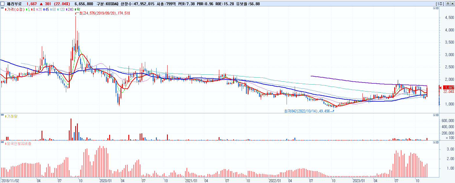 - 체리부로 (1,667원 ▲ 22.04% , 시총: 799억, 거래량: 6,658,616, 거래대금:109억)