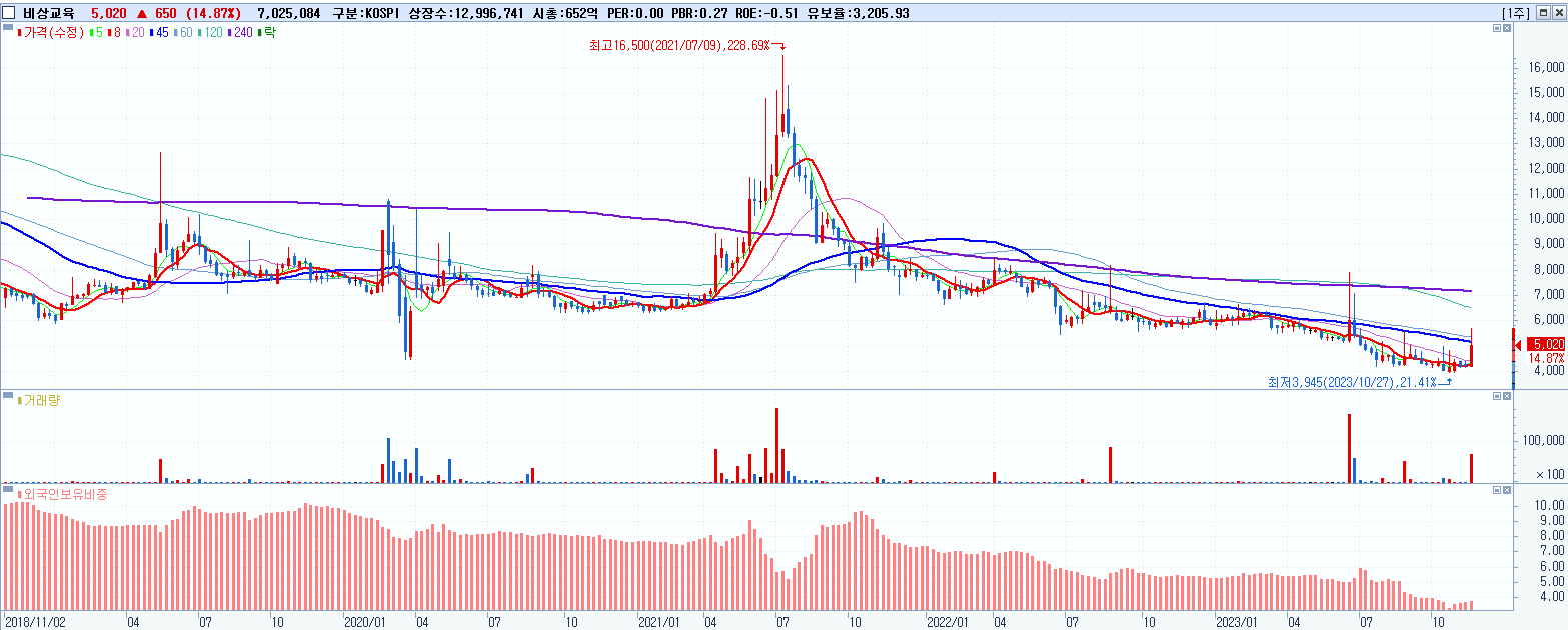 - 비상교육 (5,020원 ▲ 14.87% , 시총: 652억, 거래량: 7,032,104, 거래대금:378억)