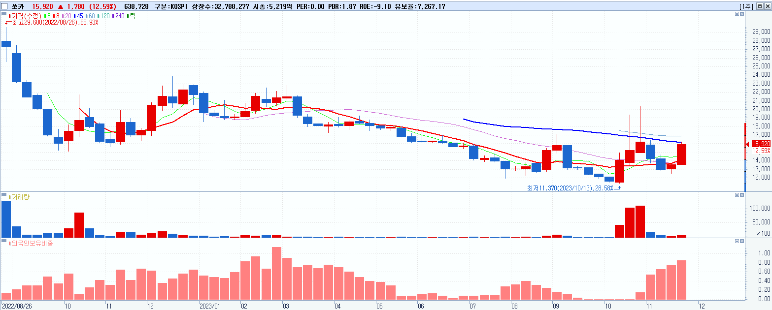 - 쏘카 (15,920원 ▲ 12.59% , 시총: 5,220억, 거래량: 638,753, 거래대금:99억)
