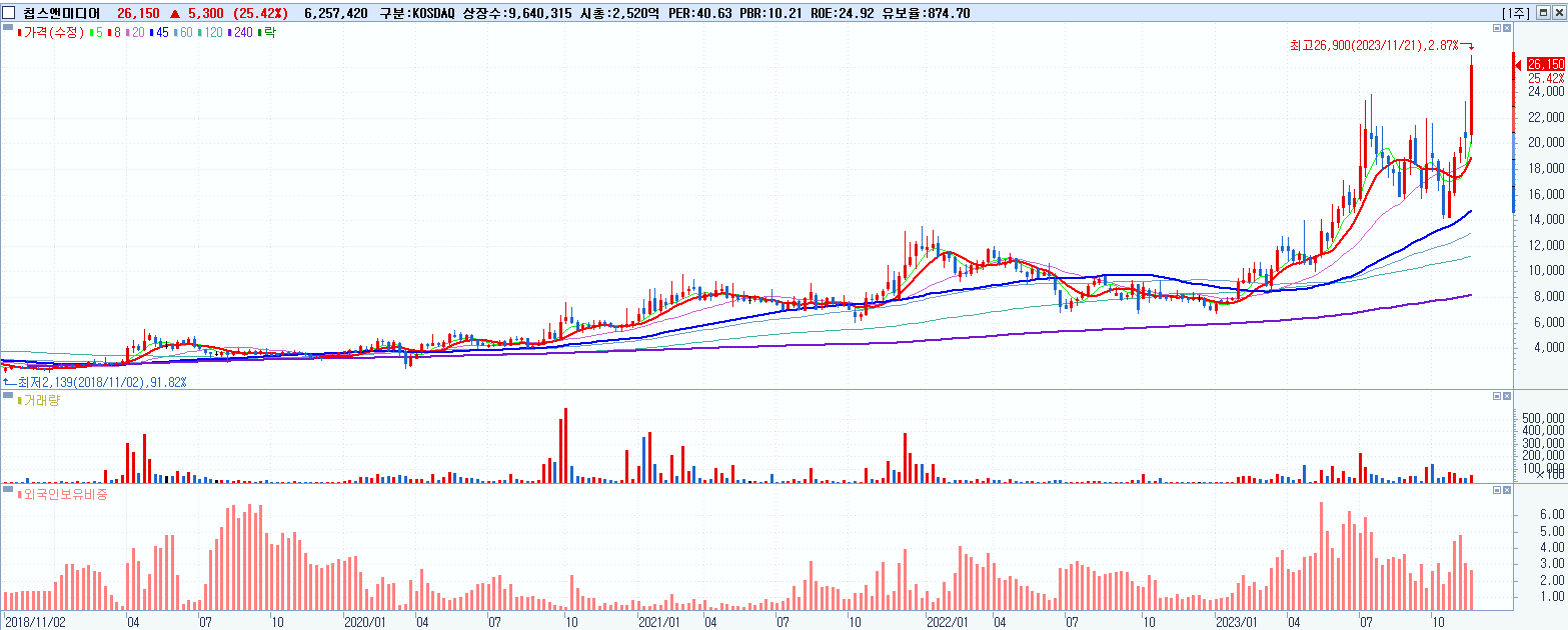 - 칩스앤미디어 (26,150원 ▲ 25.42% , 시총: 2,521억, 거래량: 6,262,432, 거래대금:1,562억)