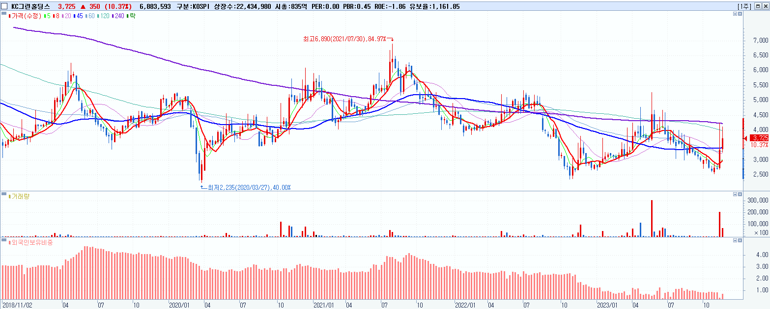 - KC그린홀딩스 (3,725원 ▲ 10.37% , 시총: 836억, 거래량: 6,891,544, 거래대금:266억)