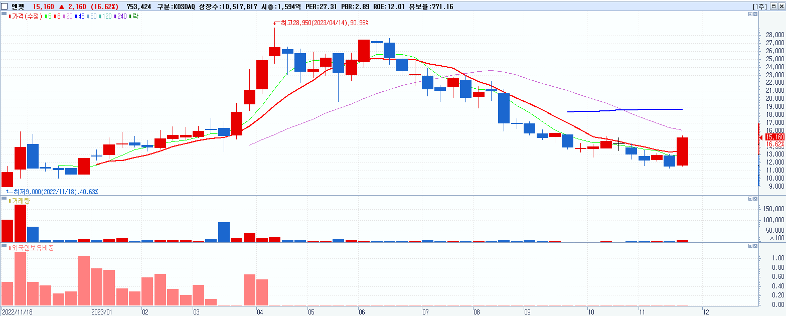 - 엔젯 (15,160원 ▲ 16.62% , 시총: 1,595억, 거래량: 753,613, 거래대금:109억)
