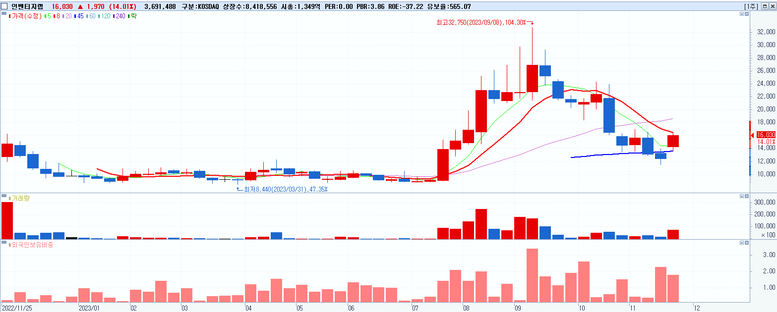 - 인벤티지랩 (16,030원 ▲ 14.01% , 시총: 1,349억, 거래량: 3,692,919, 거래대금:570억)