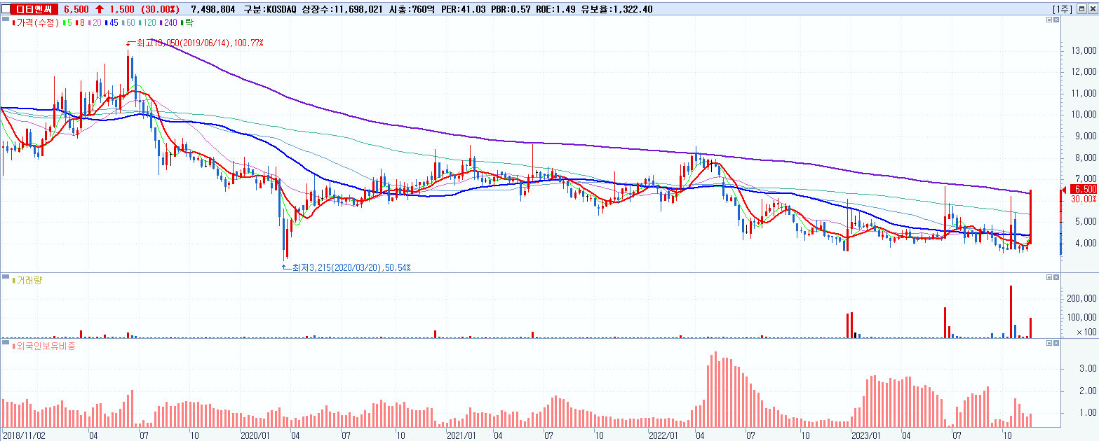 2.디티앤씨 6,500원 ▲ 30% (KOSDAQ, 187220)