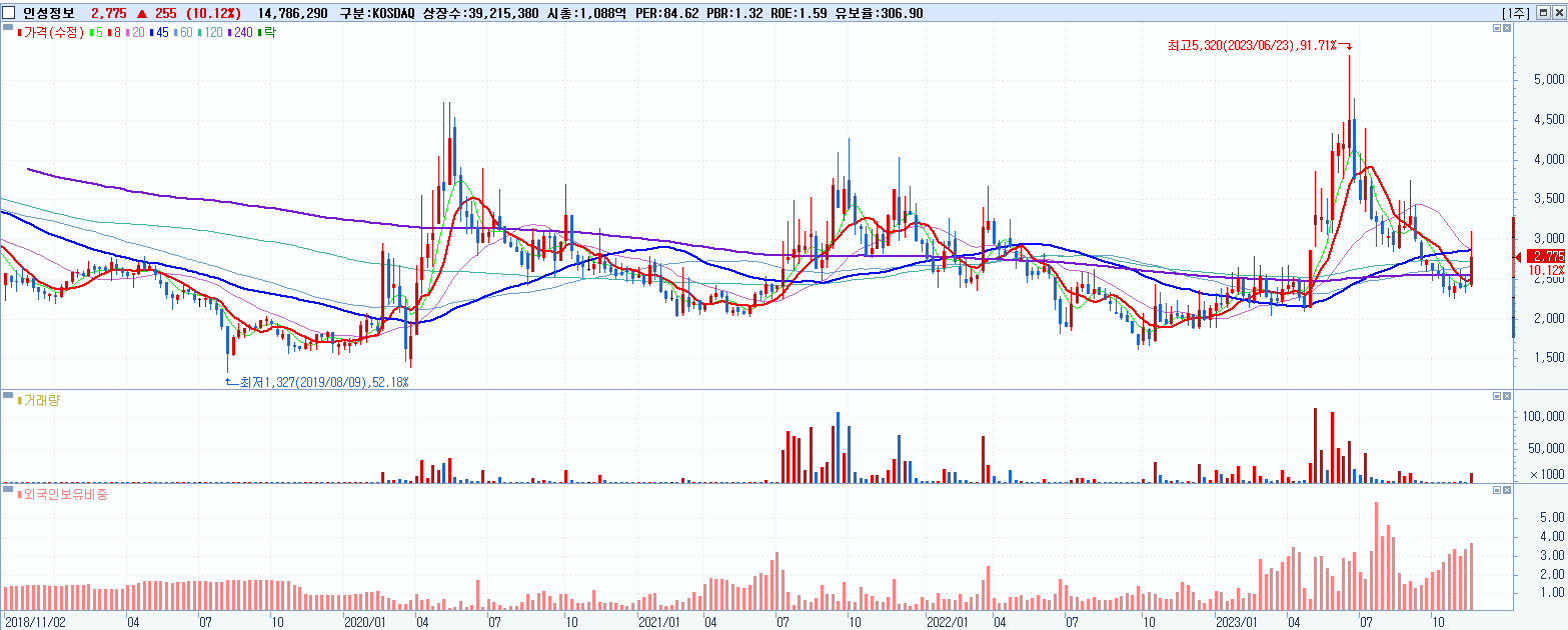 - 인성정보 (2,775원 ▲ 10.12% , 시총: 1,088억, 거래량: 14,786,453, 거래대금:437억)