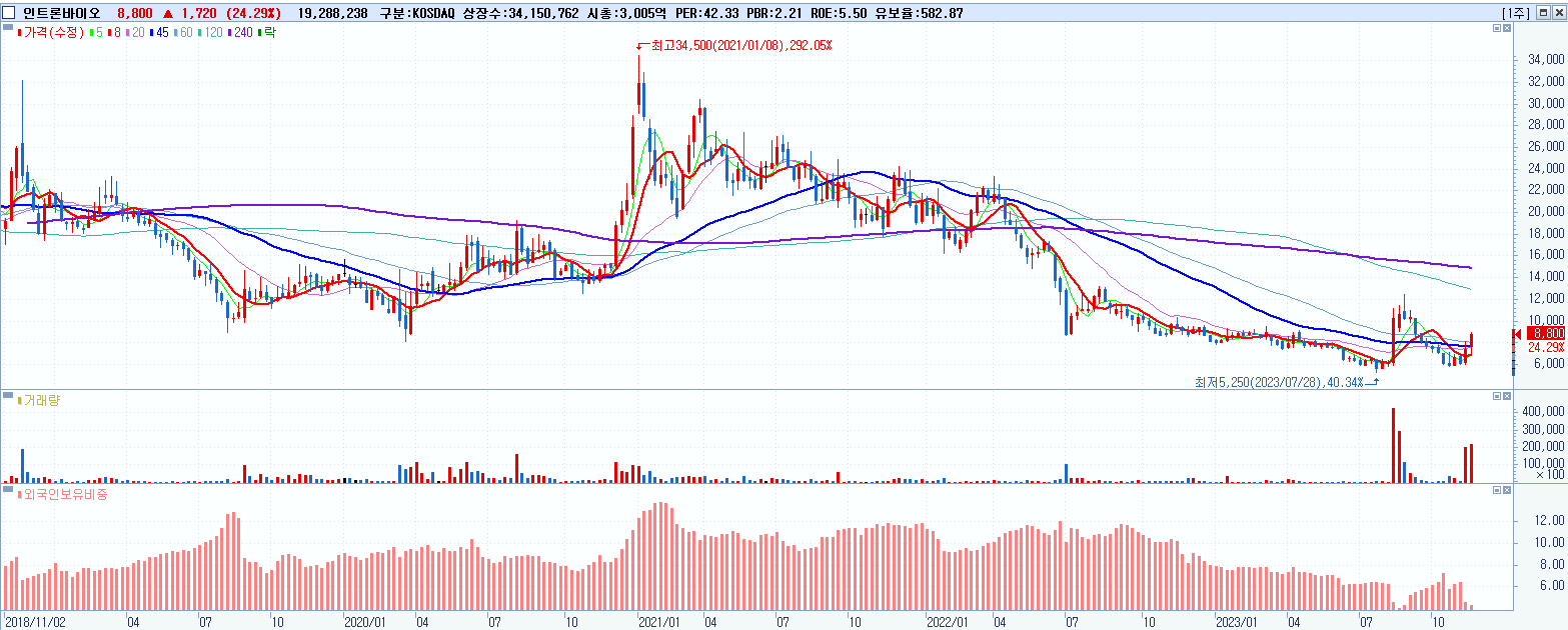 - 인트론바이오 (8,800원 ▲ 24.29% , 시총: 3,005억, 거래량: 19,335,360, 거래대금:1,617억)