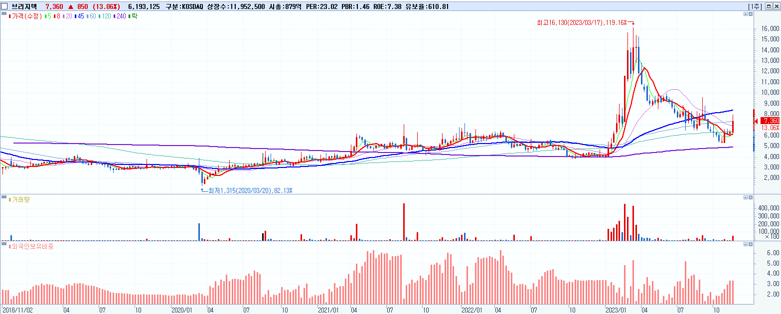 - 브리지텍 (7,360원 ▲ 13.06% , 시총: 880억, 거래량: 6,196,339, 거래대금:469억)