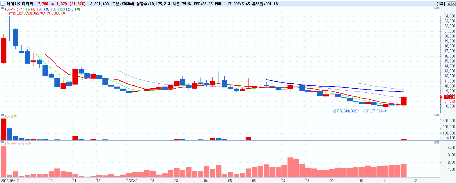 - 에이치와이티씨 (7,780원 ▲ 21.37% , 시총: 792억, 거래량: 2,309,867, 거래대금:185억)