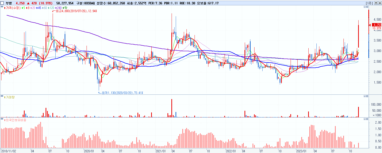 - 부방 (4,250원 ▲ 10.97% , 시총: 2,552억, 거래량: 58,239,336, 거래대금:2,464억)