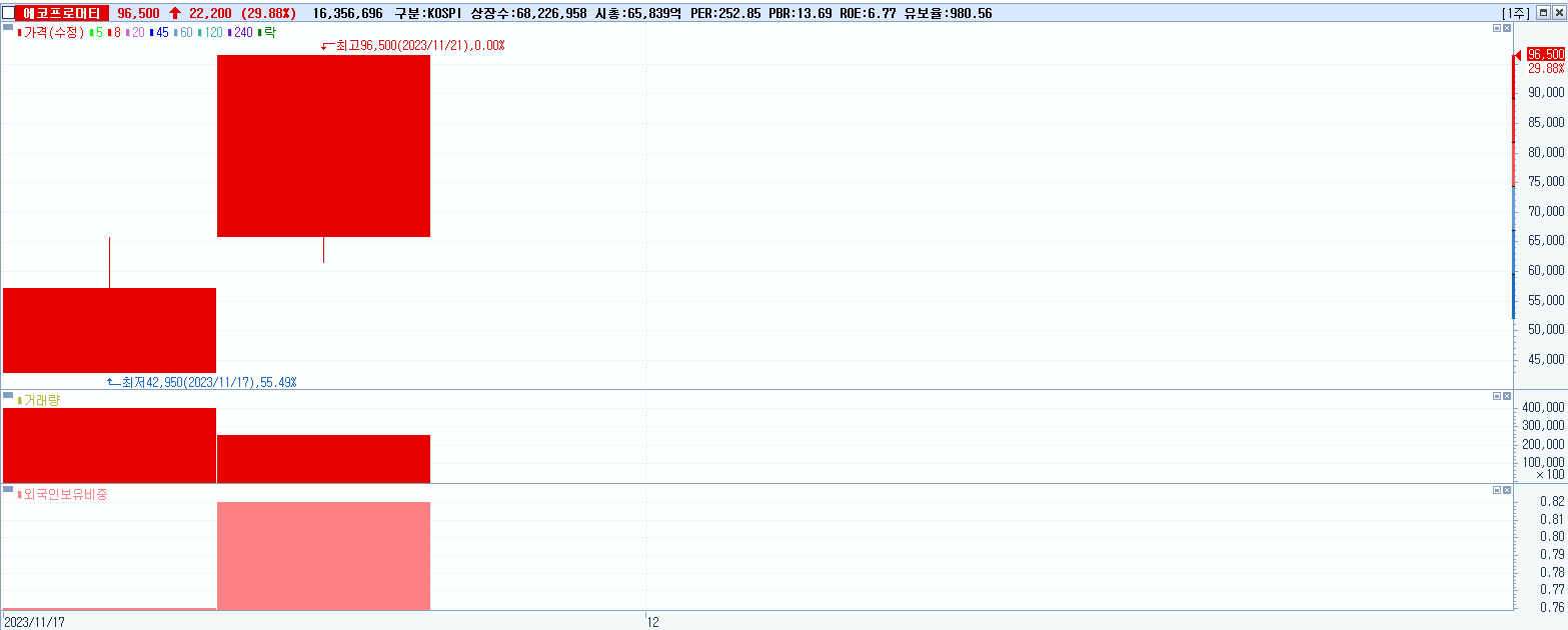 - 에코프로머티 (96,500원 ▲ 29.88% , 시총: 65,839억, 거래량: 16,357,391, 거래대금:15,057억)