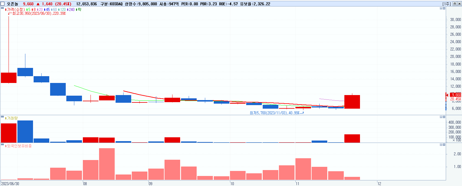 - 오픈놀 (9,660원 ▲ 20.45% , 시총: 947억, 거래량: 12,670,482, 거래대금:1,202억)