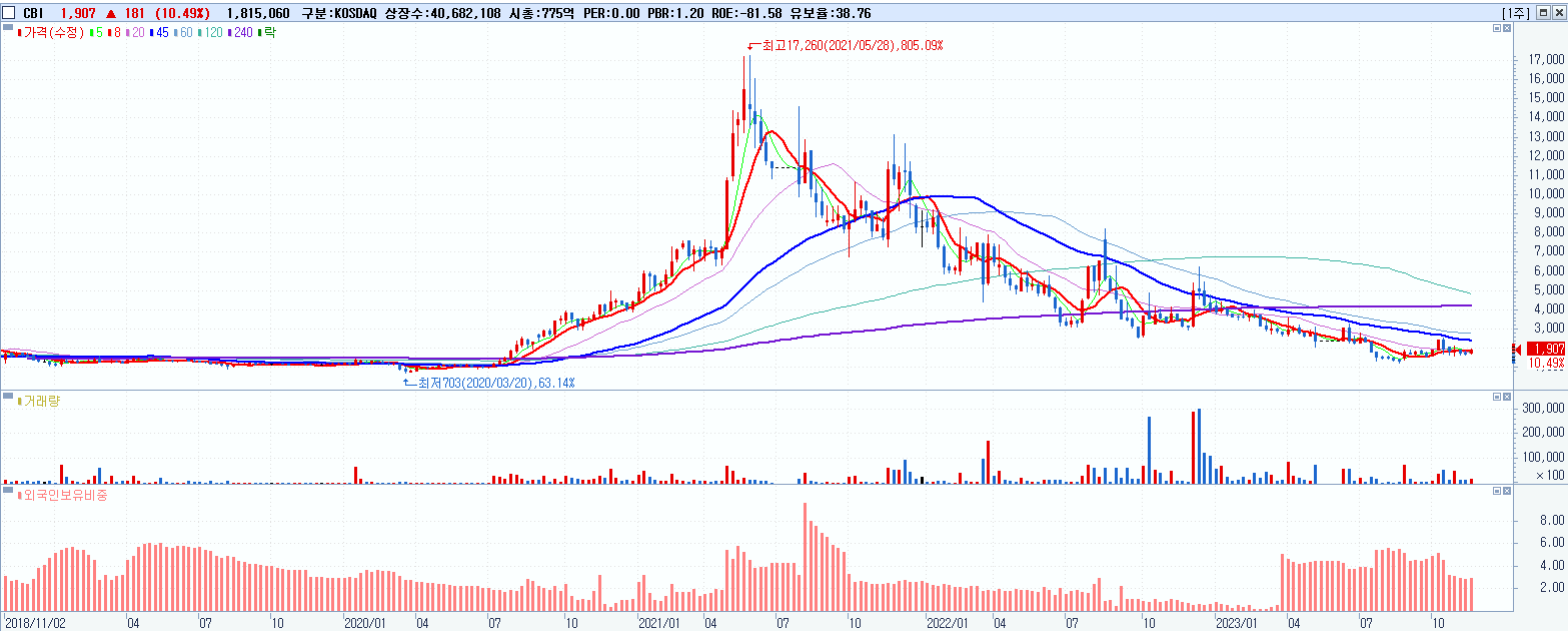 - CBI (1,907원 ▲ 10.49% , 시총: 776억, 거래량: 1,815,060, 거래대금:34억)