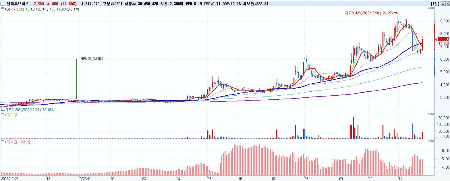 - 한국무브넥스 (7,580원 ▲ 11.8% , 시총: 2,308억, 거래량: 4,854,508, 거래대금:364억)