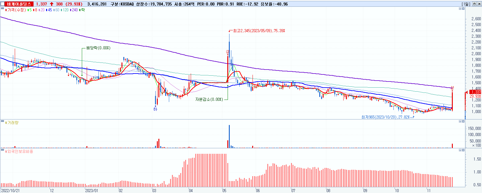 - 비케이홀딩스 (1,337원 ▲ 29.93% , 시총: 265억, 거래량: 3,417,713, 거래대금:44억)