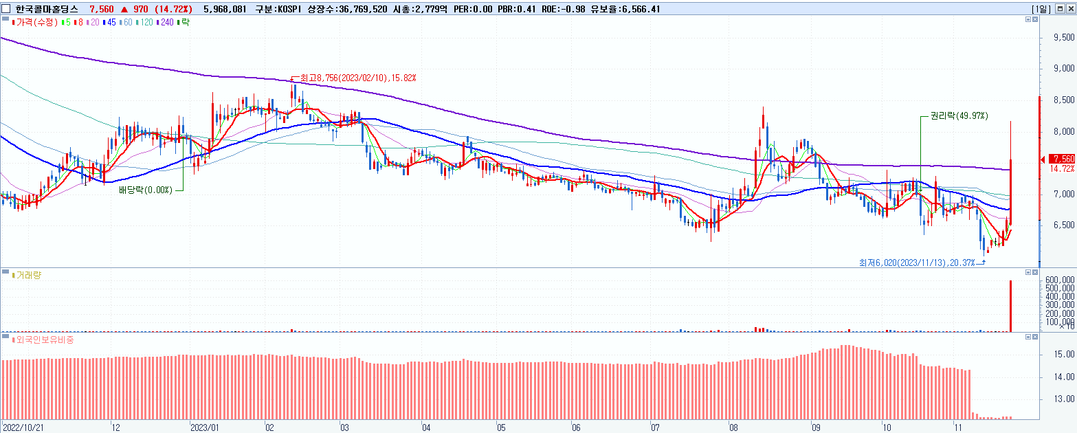 - 한국콜마홀딩스 (7,560원 ▲ 14.72% , 시총: 2,780억, 거래량: 6,005,495, 거래대금:457억)