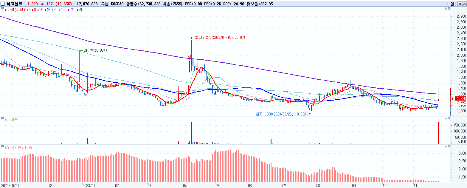 - 에코볼트 (1,220원 ▲ 12.65% , 시총: 765억, 거래량: 18,043,190, 거래대금:242억)