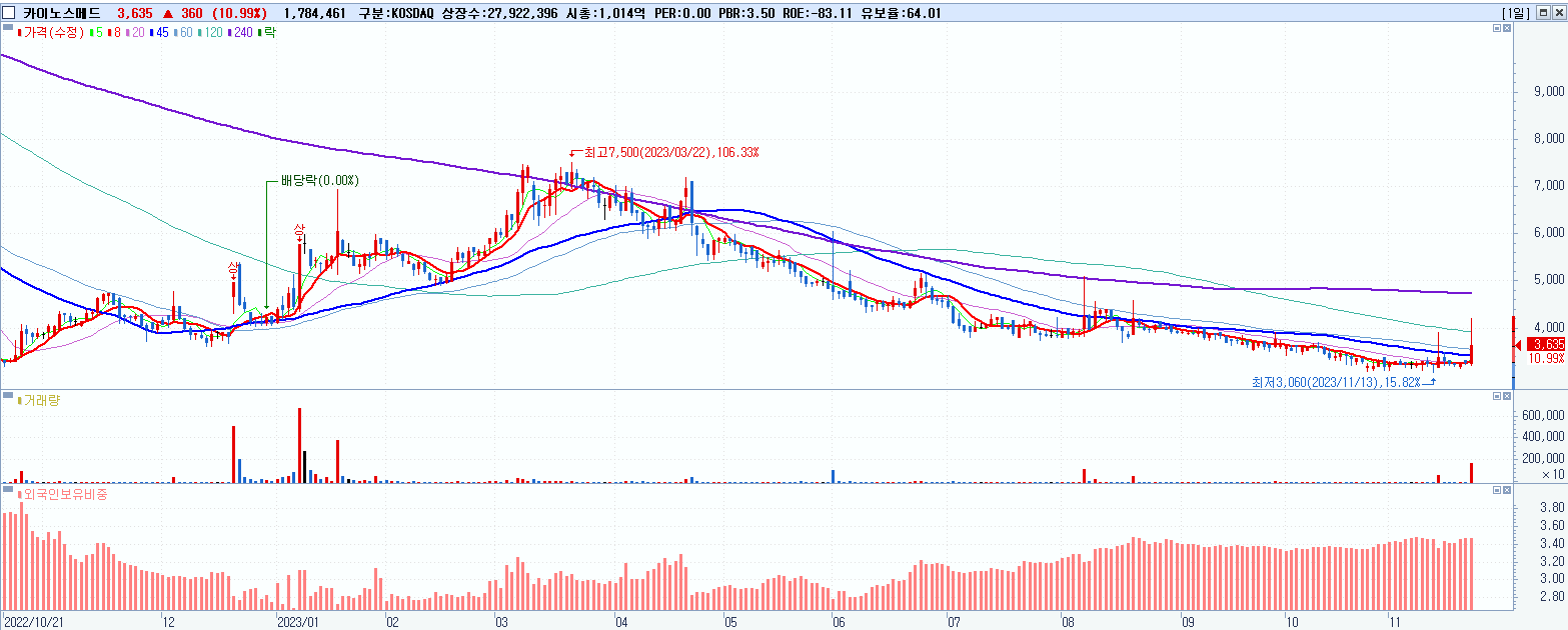 - 카이노스메드 (3,635원 ▲ 10.99% , 시총: 1,015억, 거래량: 1,786,432, 거래대금:68억)