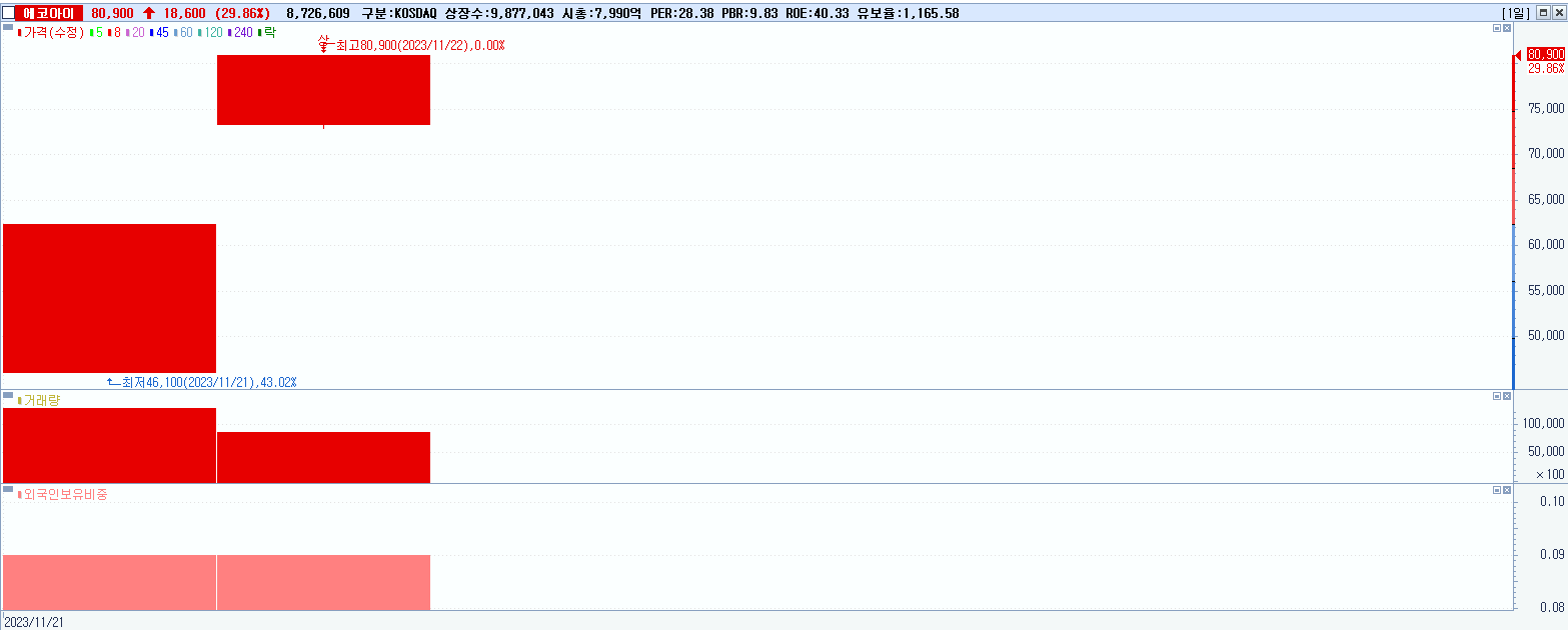- 에코아이 (80,900원 ▲ 29.86% , 시총: 7,991억, 거래량: 8,777,855, 거래대금:6,791억)