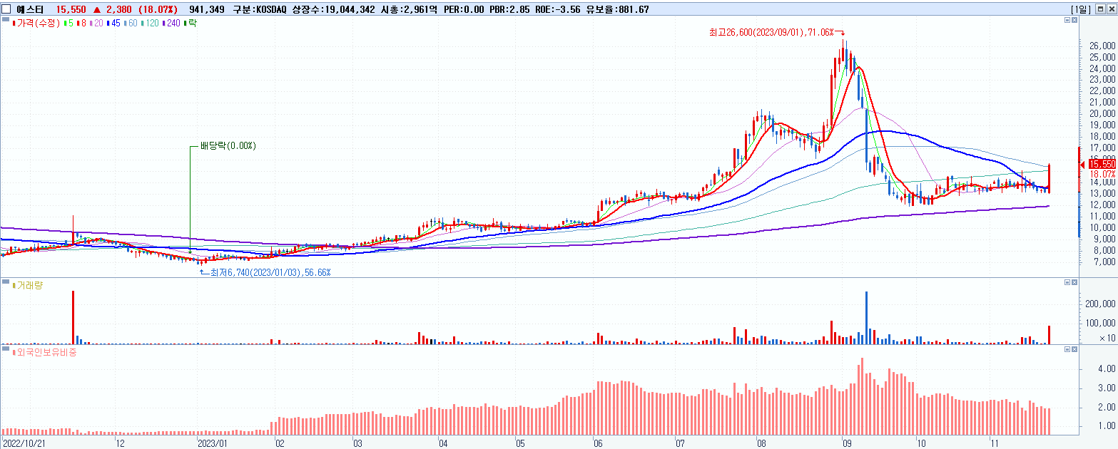 - 예스티 (15,550원 ▲ 18.07% , 시총: 2,961억, 거래량: 943,818, 거래대금:140억)