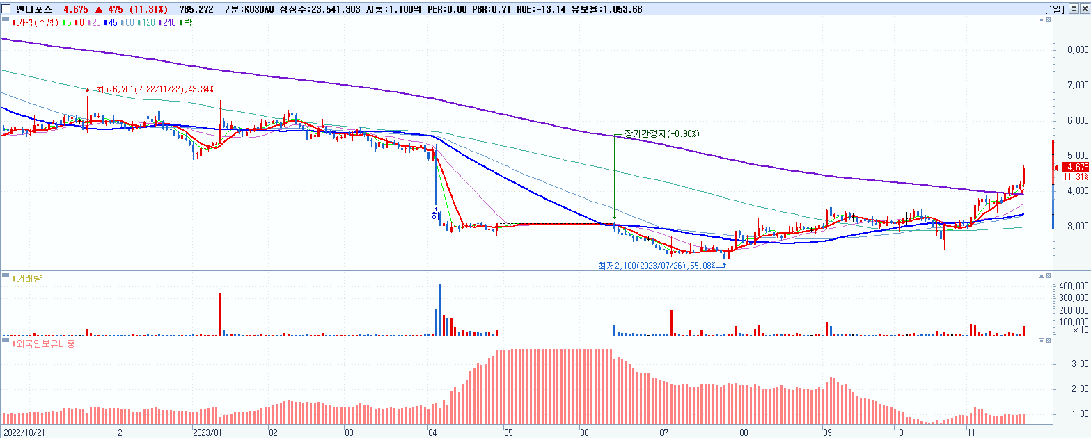 - 앤디포스 (4,675원 ▲ 11.31% , 시총: 1,101억, 거래량: 785,691, 거래대금:35억)