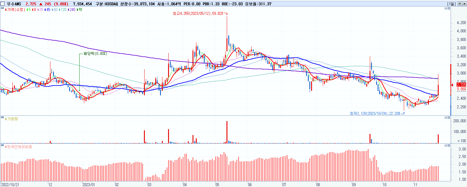 - 우수AMS (2,725원 ▲ 9.88% , 시총: 1,065억, 거래량: 7,942,990, 거래대금:221억)