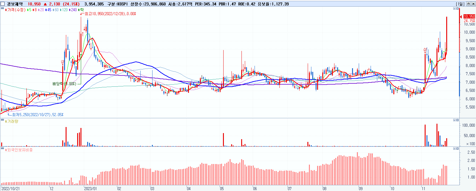 - 경보제약 (10,950원 ▲ 24.15% , 시총: 2,618억, 거래량: 4,167,587, 거래대금:405억)