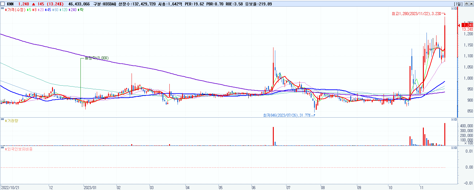 - KNN (1,240원 ▲ 13.24% , 시총: 1,642억, 거래량: 46,974,297, 거래대금:576억)