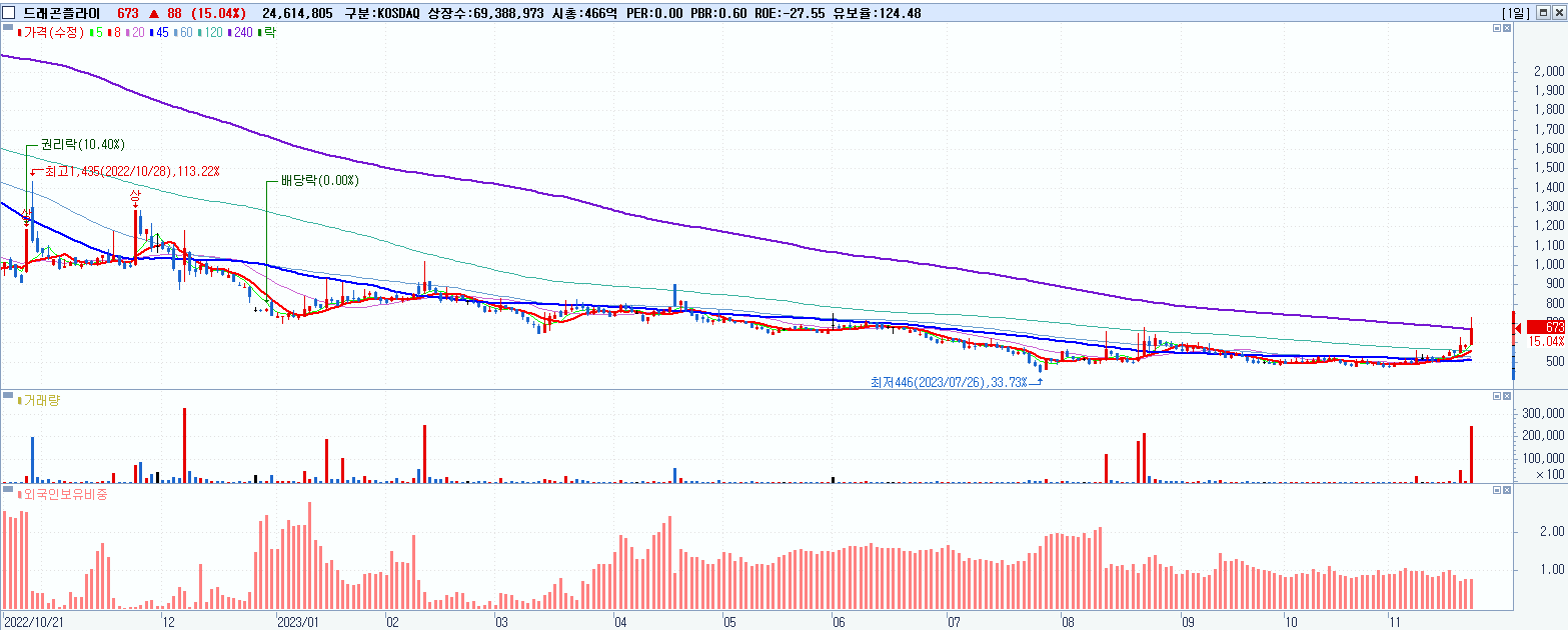 - 드래곤플라이 (673원 ▲ 15.04% , 시총: 467억, 거래량: 24,648,740, 거래대금:167억)
