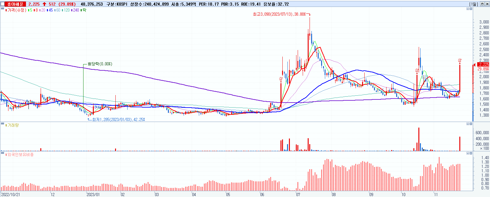 4.흥아해운 2,225원 ▲ 29.89% (KOSPI, 003280)