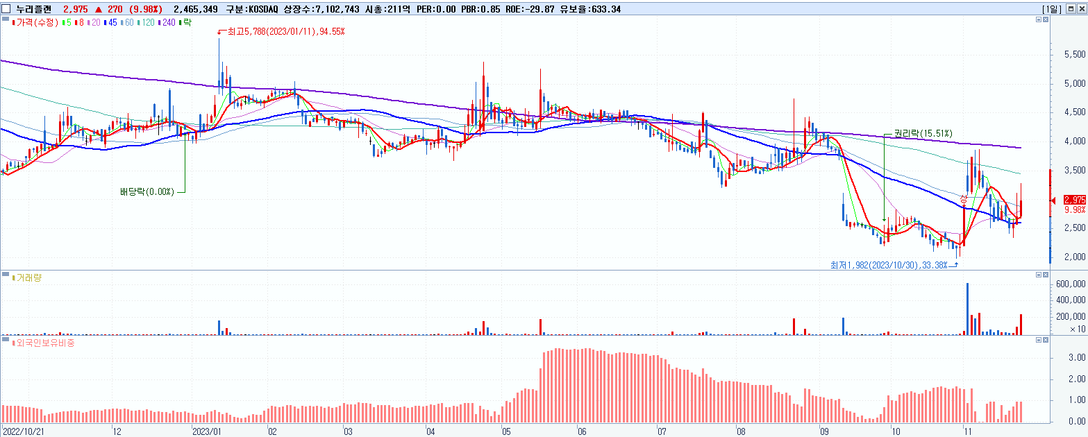 - 누리플랜 (2,975원 ▲ 9.98% , 시총: 211억, 거래량: 2,470,151, 거래대금:74억)