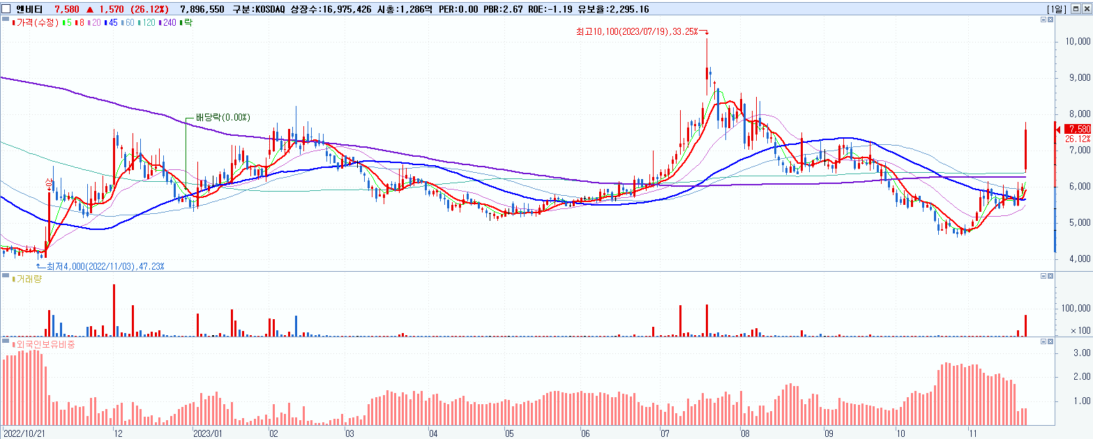 - 엔비티 (7,580원 ▲ 26.12% , 시총: 1,287억, 거래량: 7,913,823, 거래대금:586억)