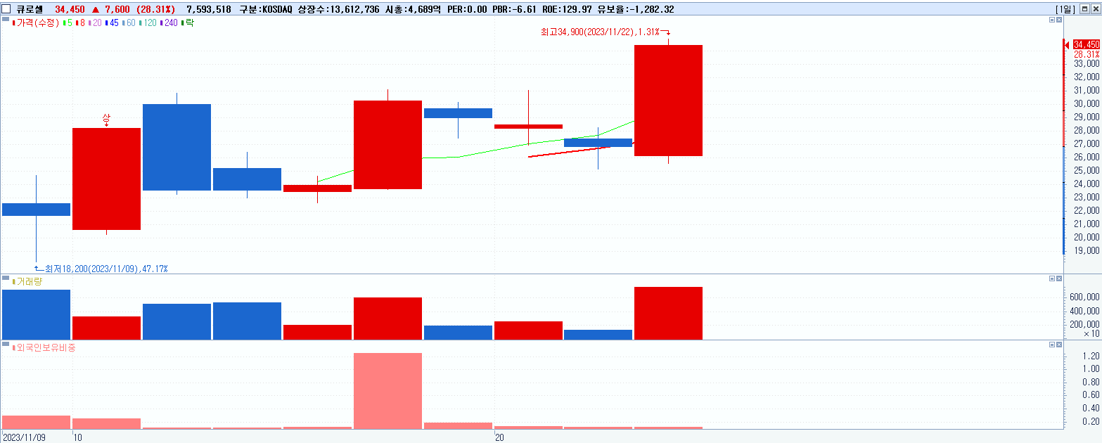 - 큐로셀 (34,450원 ▲ 28.31% , 시총: 4,690억, 거래량: 7,634,515, 거래대금:2,410억)