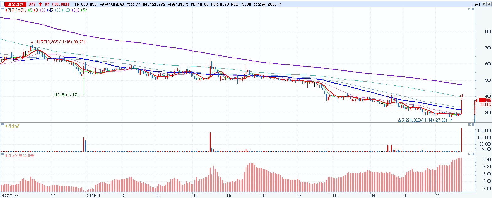 - 네오리진 (377원 ▲ 30% , 시총: 394억, 거래량: 16,823,527, 거래대금:59억)