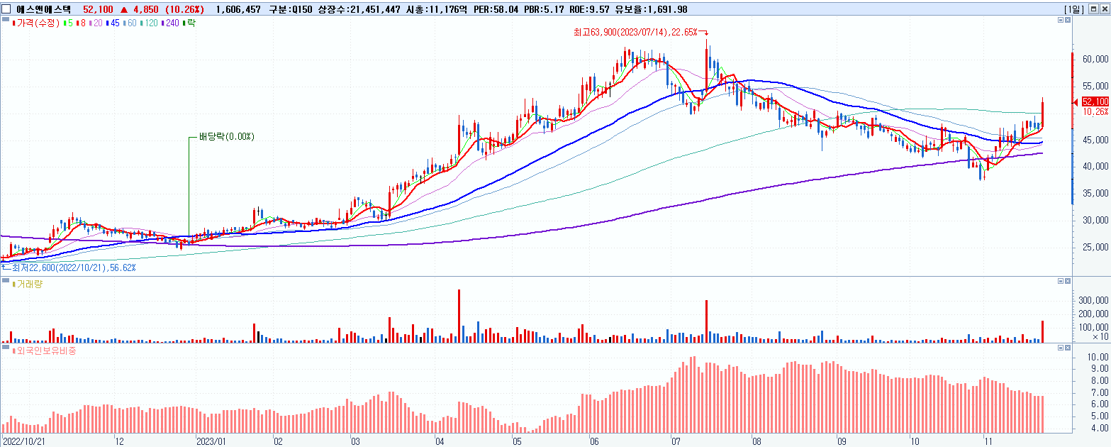 - 에스앤에스텍 (52,100원 ▲ 10.26% , 시총: 11,176억, 거래량: 1,609,825, 거래대금:818억)