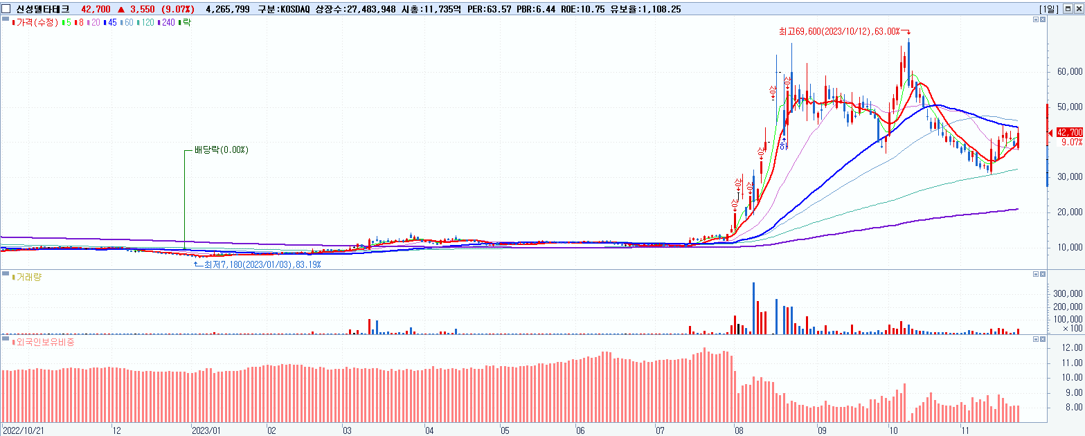 - 신성델타테크 (42,700원 ▲ 9.07% , 시총: 11,736억, 거래량: 4,295,918, 거래대금:1,806억)