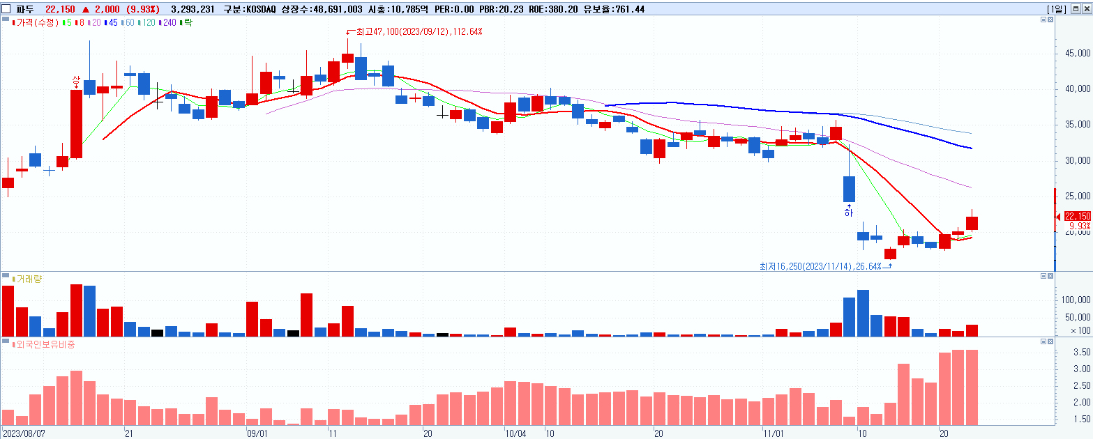 - 파두 (22,150원 ▲ 9.93% , 시총: 10,785억, 거래량: 3,296,913, 거래대금:729억)