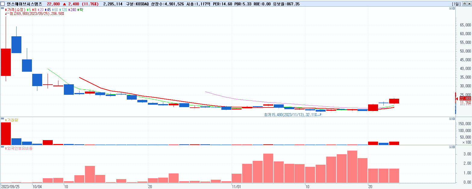 - 인스웨이브시스템즈 (22,800원 ▲ 11.76% , 시총: 1,118억, 거래량: 2,299,107, 거래대금:501억)