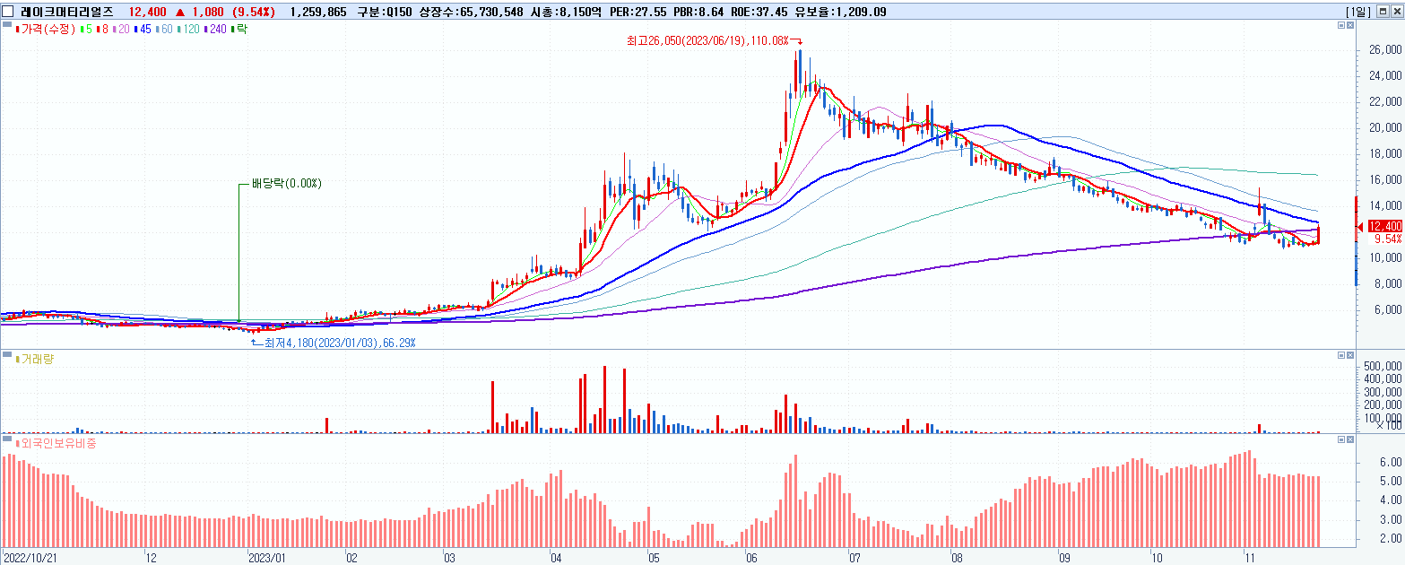 - 레이크머티리얼즈 (12,400원 ▲ 9.54% , 시총: 8,151억, 거래량: 1,278,754, 거래대금:154억)