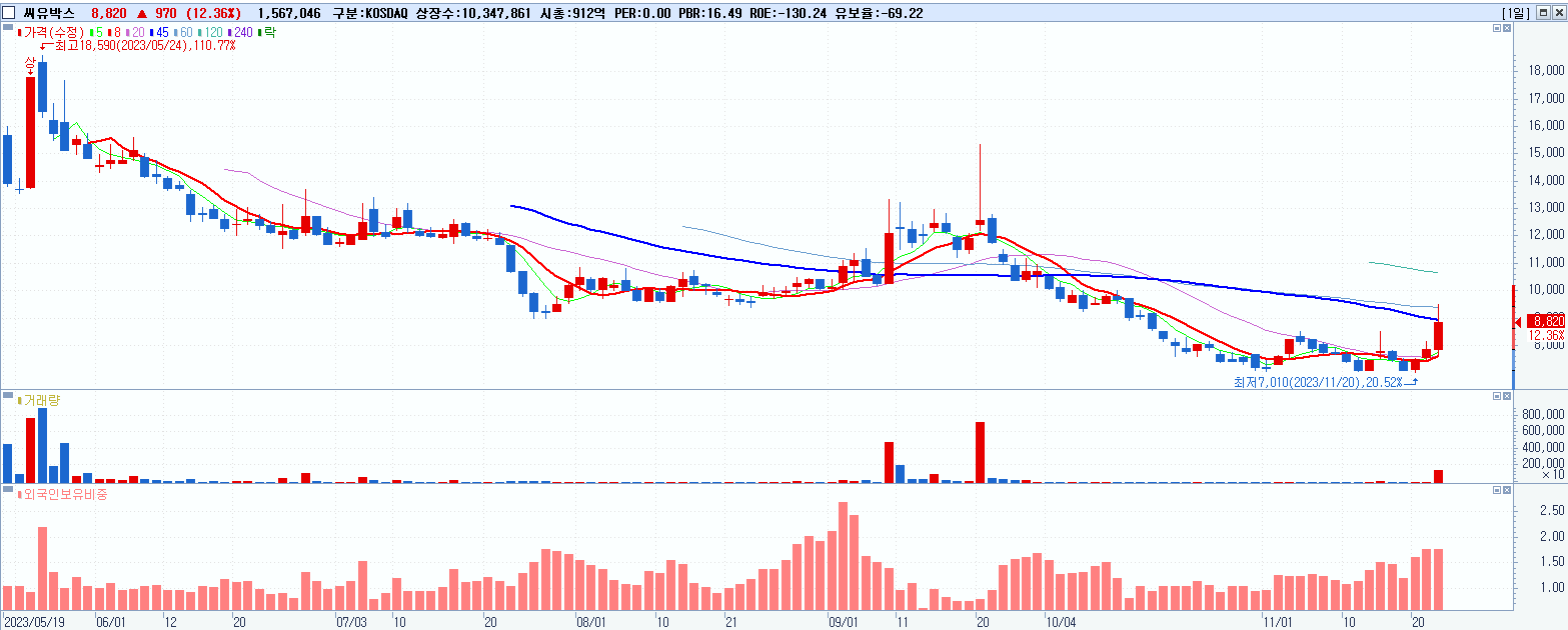 - 씨유박스 (8,820원 ▲ 12.36% , 시총: 913억, 거래량: 1,730,909, 거래대금:152억)