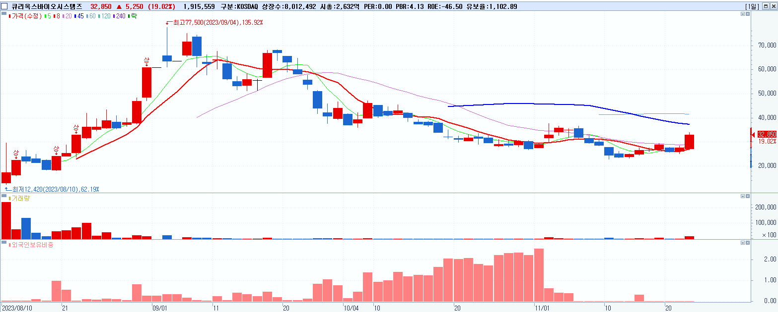 - 큐리옥스바이오시스템즈 (32,850원 ▲ 19.02% , 시총: 2,632억, 거래량: 1,922,752, 거래대금:612억)