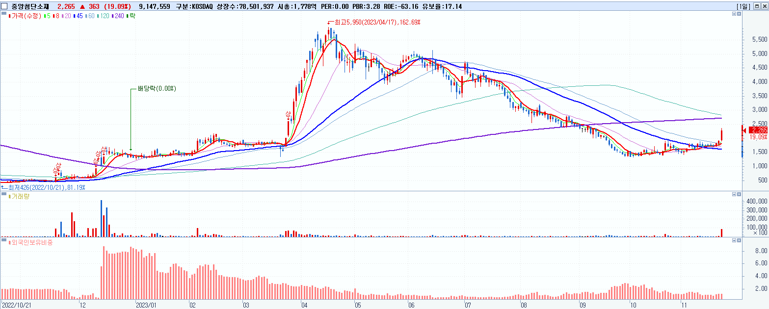 - 중앙첨단소재 (2,265원 ▲ 19.09% , 시총: 1,778억, 거래량: 9,257,978, 거래대금:205억)