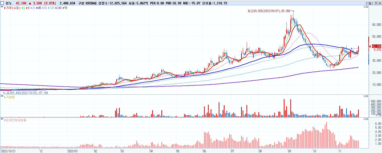 - 뷰노 (42,100원 ▲ 9.07% , 시총: 5,063억, 거래량: 2,508,233, 거래대금:1,012억)