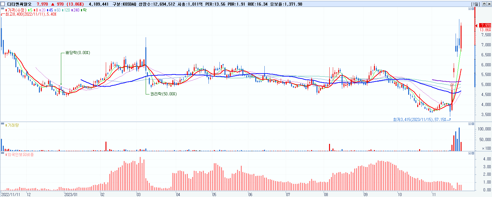 - 디티앤씨알오 (7,970원 ▲ 13.86% , 시총: 1,012억, 거래량: 4,248,804, 거래대금:323억)