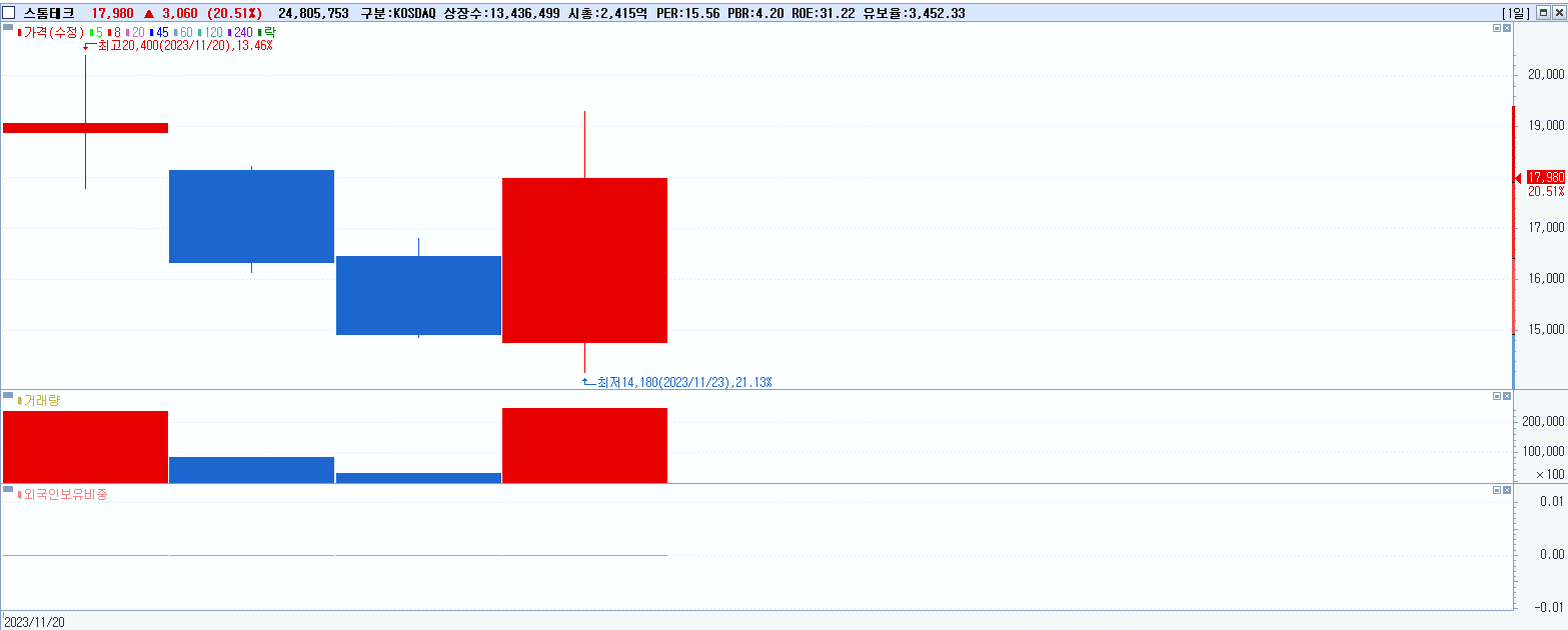 - 스톰테크 (17,980원 ▲ 20.51% , 시총: 2,416억, 거래량: 25,212,590, 거래대금:4,430억)