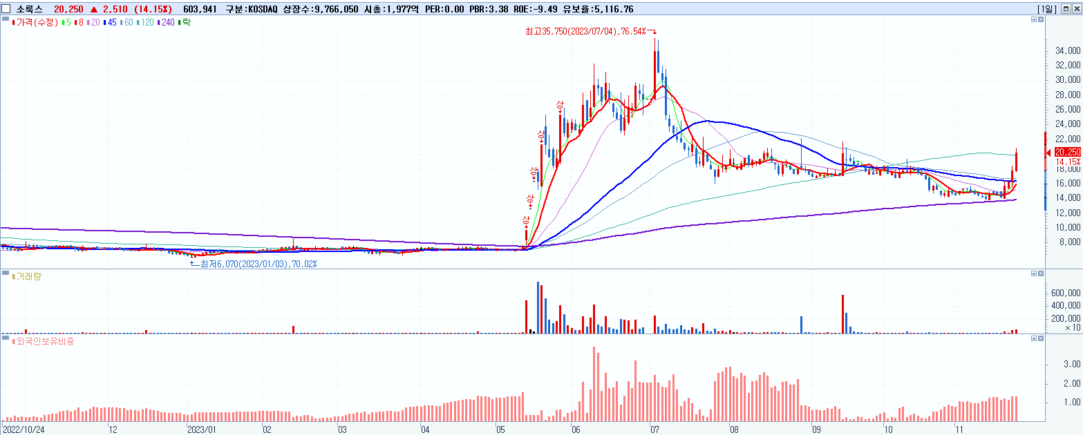 - 소룩스 (20,250원 ▲ 14.15% , 시총: 1,978억, 거래량: 606,691, 거래대금:117억)